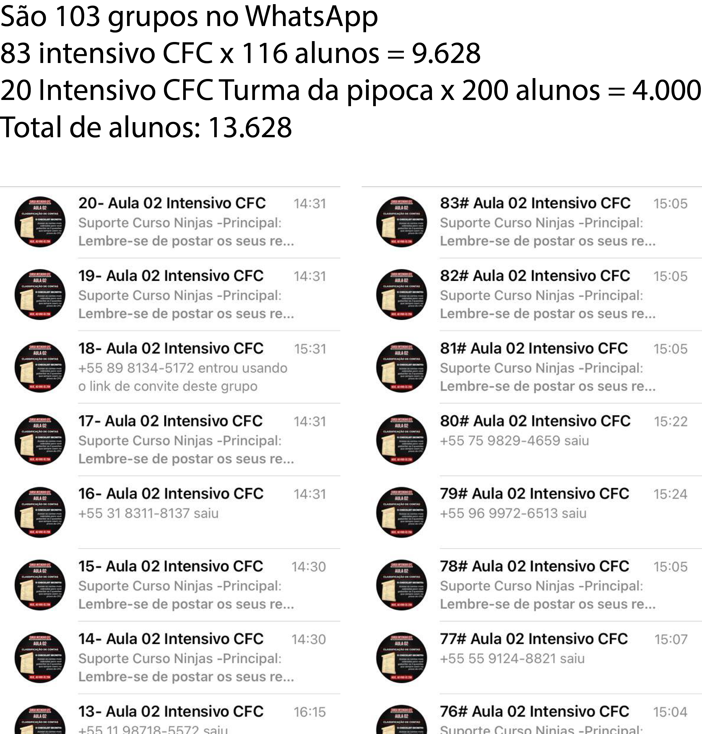 13.628 alunos inscritos no Curso Intensivo CFC Gratuito, olha o número de grupos no whatsapp: